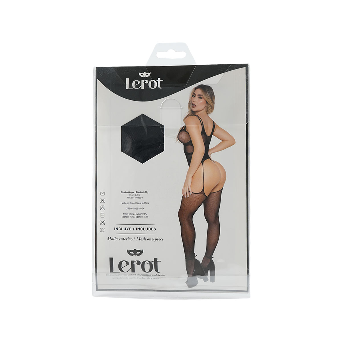 Diseño: Body de malla con tiras cruzadas en la parte central, combinado con medias de red que alargan tus piernas y añaden un toque de provocación.