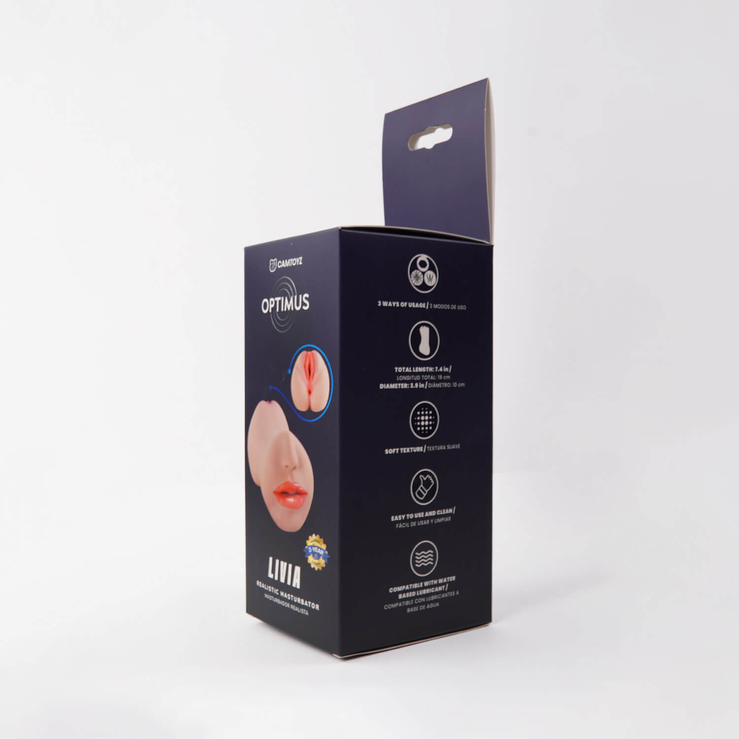 Siente el realismo al máximo con LIVIA, el masturbador de la línea Optimus de Camtoyz. Diseñado para brindarte una experiencia ultra realista, cuenta con doble entrada (vaginal y oral) y una textura interna que simula sensaciones intensas y naturales. Su forma ergonómica y su material suave al tacto te garantizan comodidad y placer en cada uso.